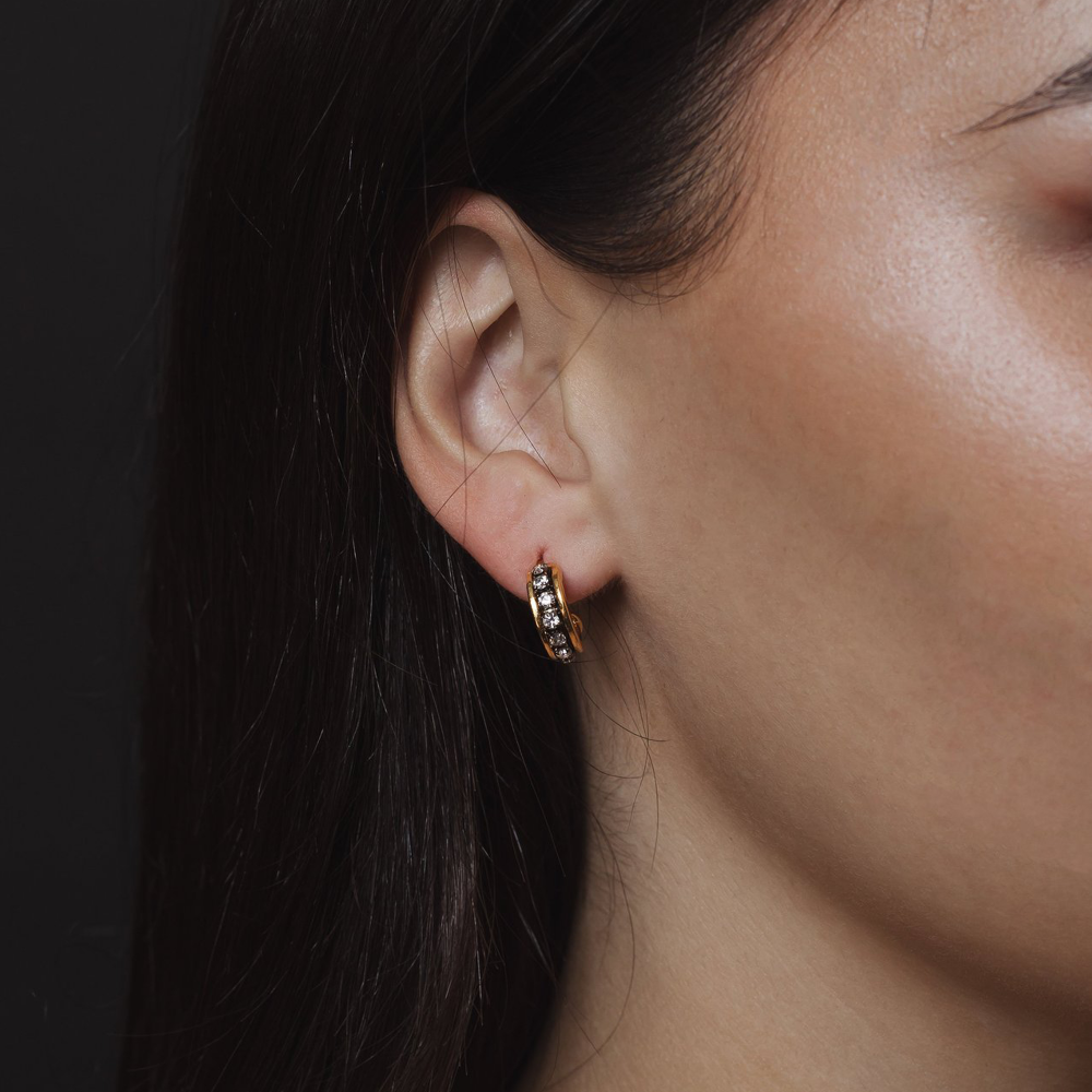 Our Pia earrings are inspired by the classic look of gold hoops, but with a slight twist. These earrings feature some zirconia gems along the hoops, adding a bit more sparkle to the everyday classic earrings.