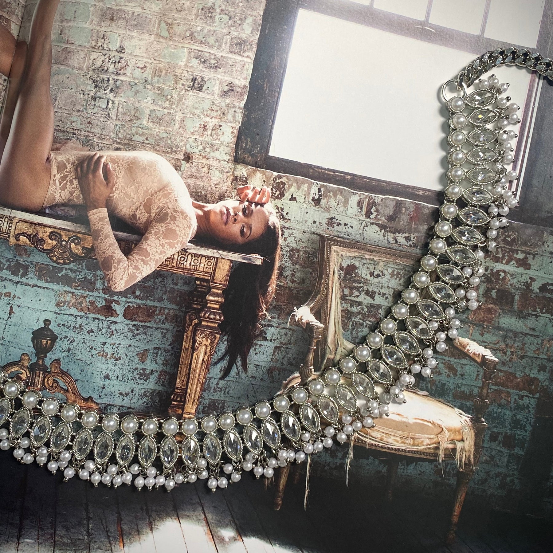 From our HUNTS selection, a handmade brass necklace with crystals and pearls that gives the piece a vintage look.