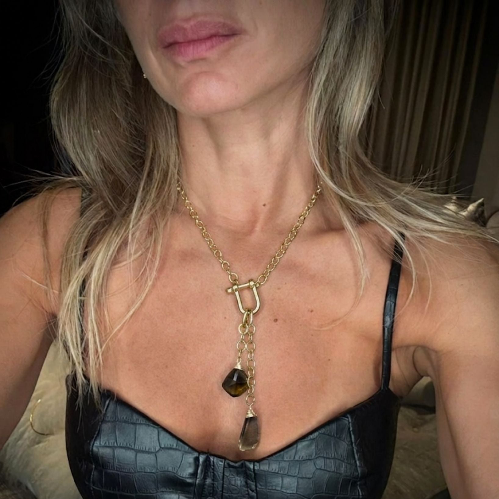Eleva tu estilo con este collar tipo lariat que combina la robustez de una cadena clásica con la delicadeza de colgantes de piedra natural.
