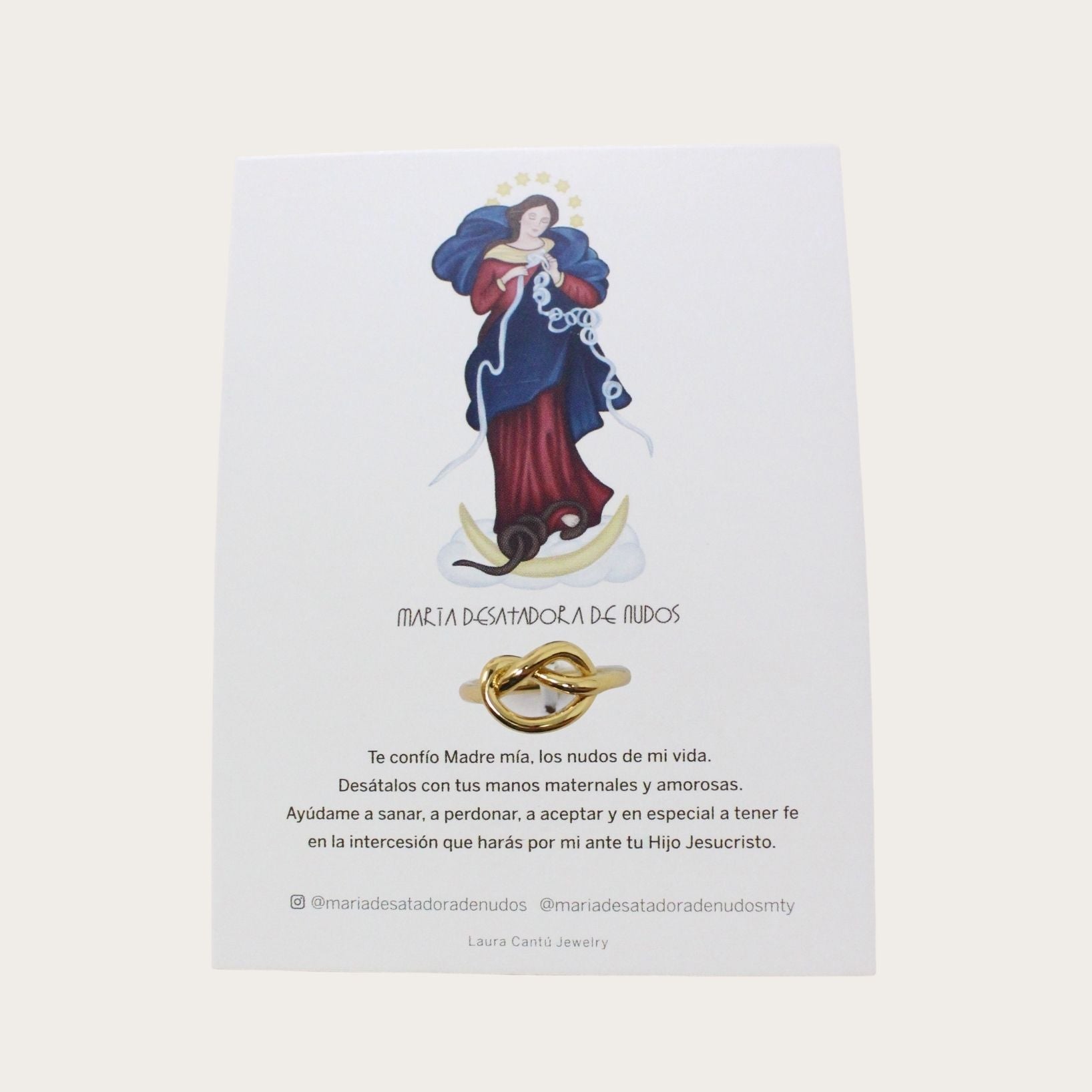 Más que un accesorio, este anillo es un símbolo de esperanza. Su diseño central de nudo entrelazado rinde homenaje a María Desatadora de Nudos, representando la sanación y la resolución de conflictos. Con un acabado pulido impecable, es la pieza perfecta para quienes buscan llevar un recordatorio de fe con un estilo sofisticado y atemporal.